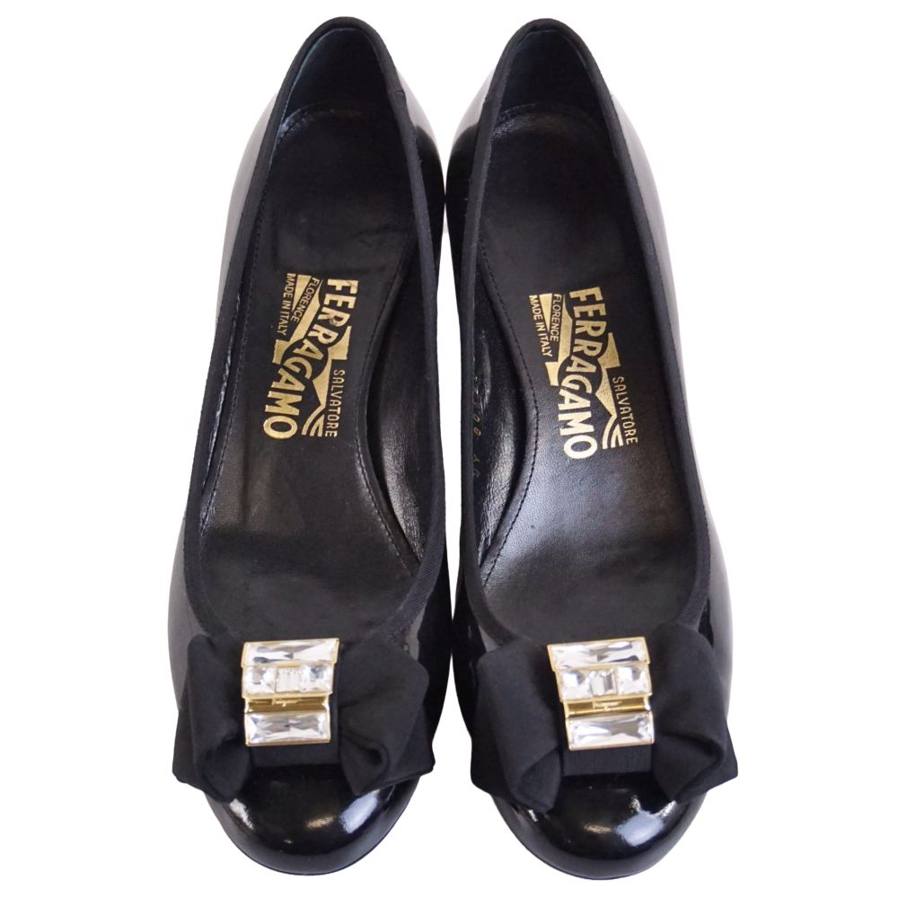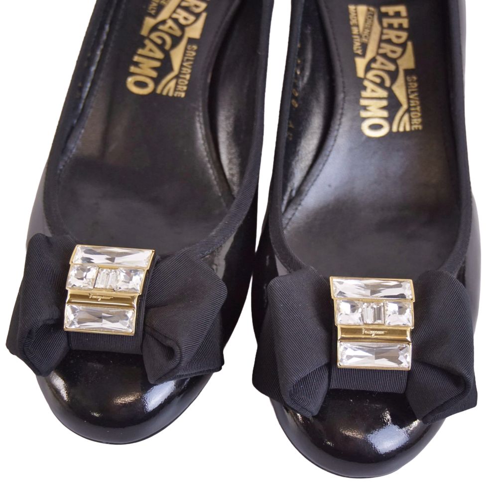 サルヴァトーレ フェラガモ Salvatore Ferragamo パンプス リボン ビジュー装飾 エナメルレザー ヒール シューズ 靴 レディース イタリア製 ブラック サイズ6.5(24cm相当)