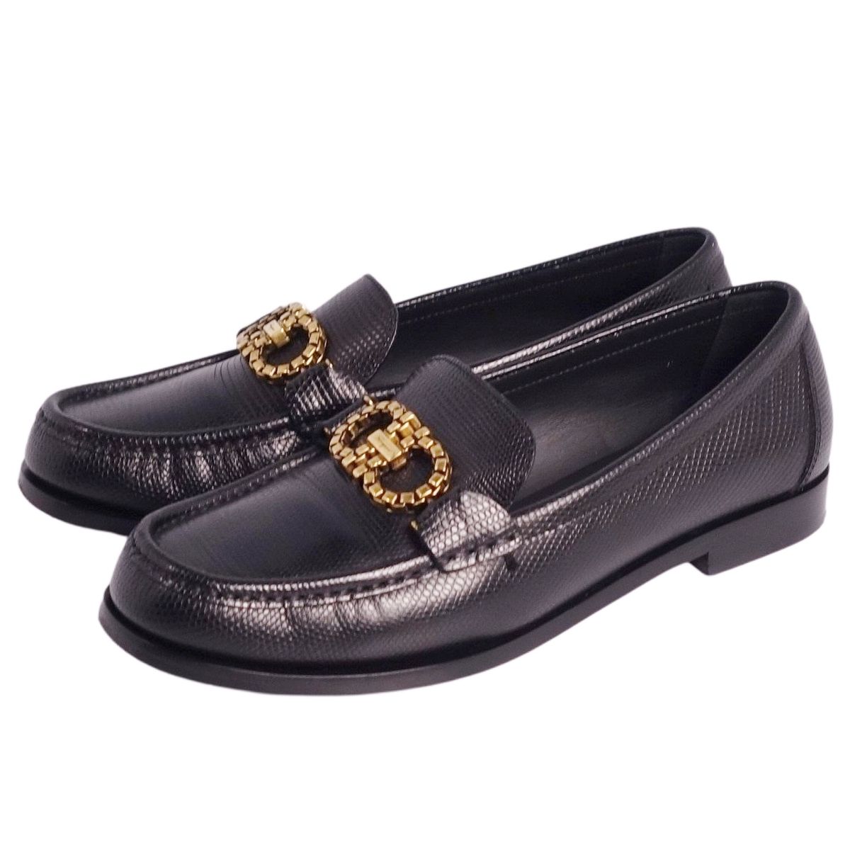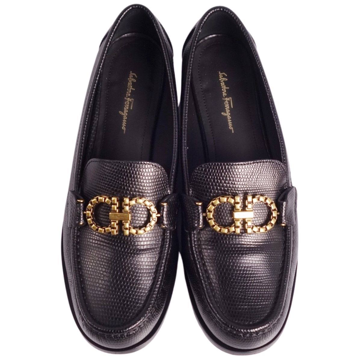 サルヴァトーレ フェラガモ Salvatore Ferragamo ローファー モカシン ガンチーニ リザード型押し シューズ 靴 レディース ブラック サイズ6.5(24cm相当)