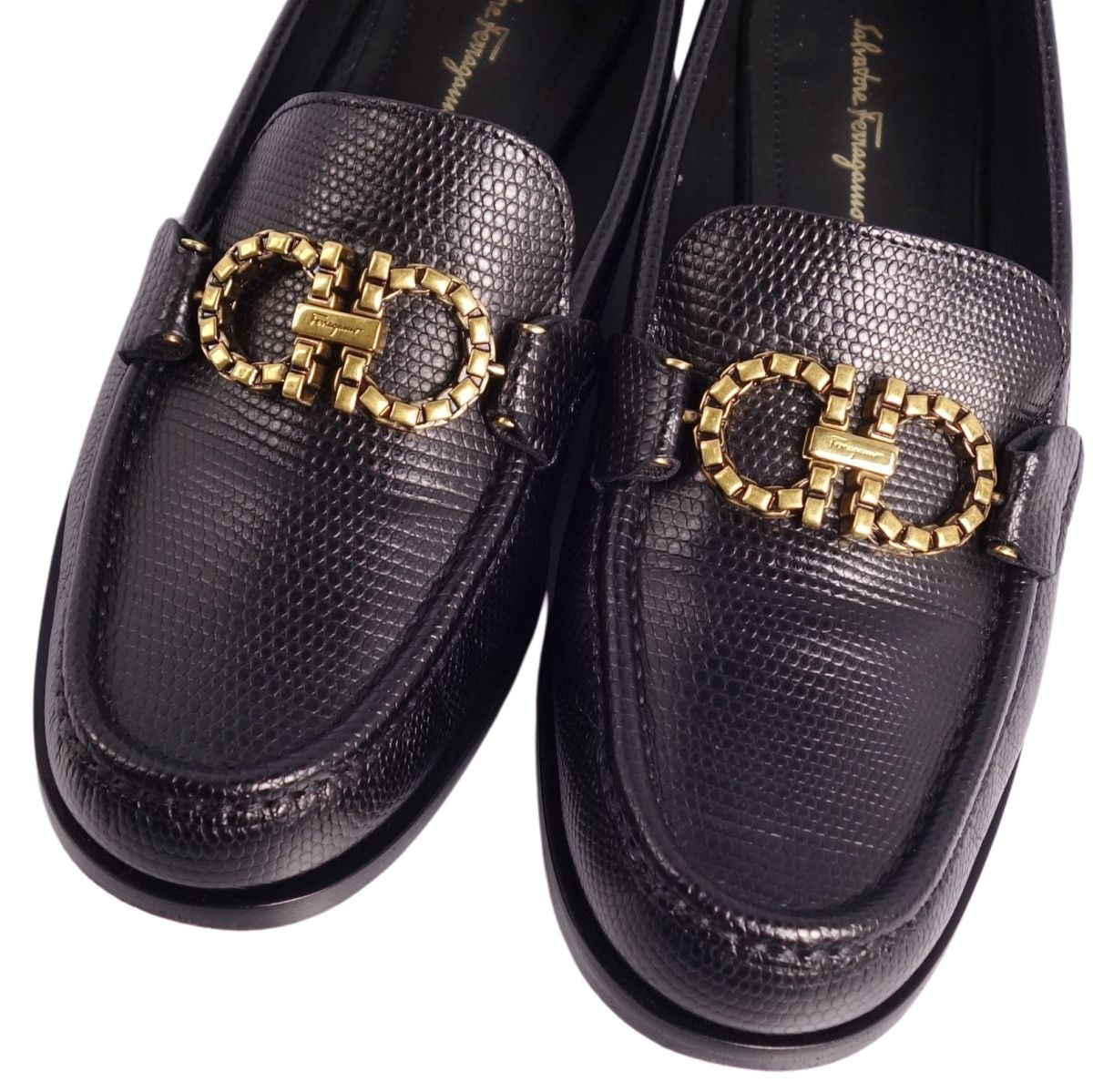 【美品】サルヴァトーレ フェラガモ Salvatore Ferragamo ローファー モカシン ガンチーニ リザード型押し シューズ 靴 レディース 6.5(24cm相当) ブラック【中古】