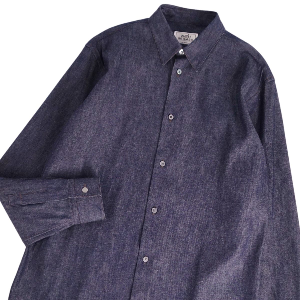 【新品同様】エルメス HERMES シャツ 24SS デニムシャツ ロングスリーブ 長袖 コットン トップス メンズ フランス製 38/15 インディゴブルー【中古】