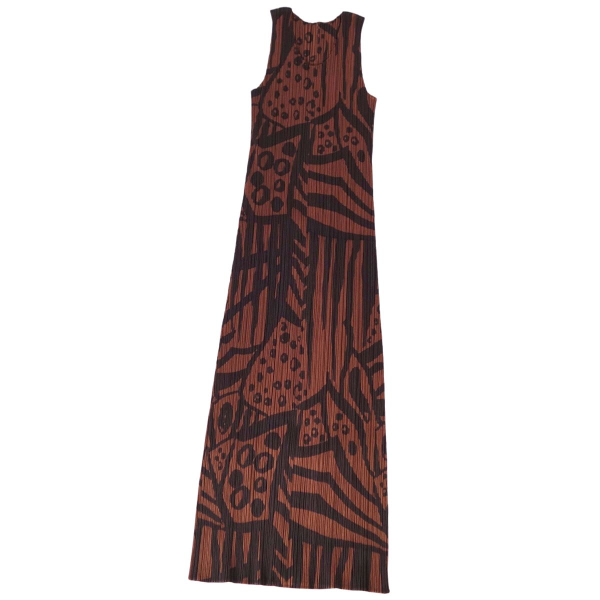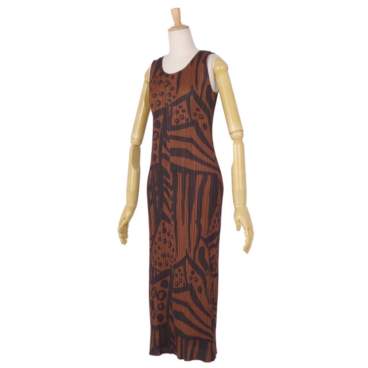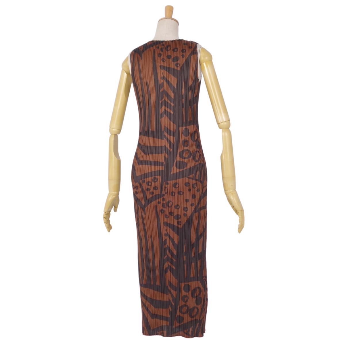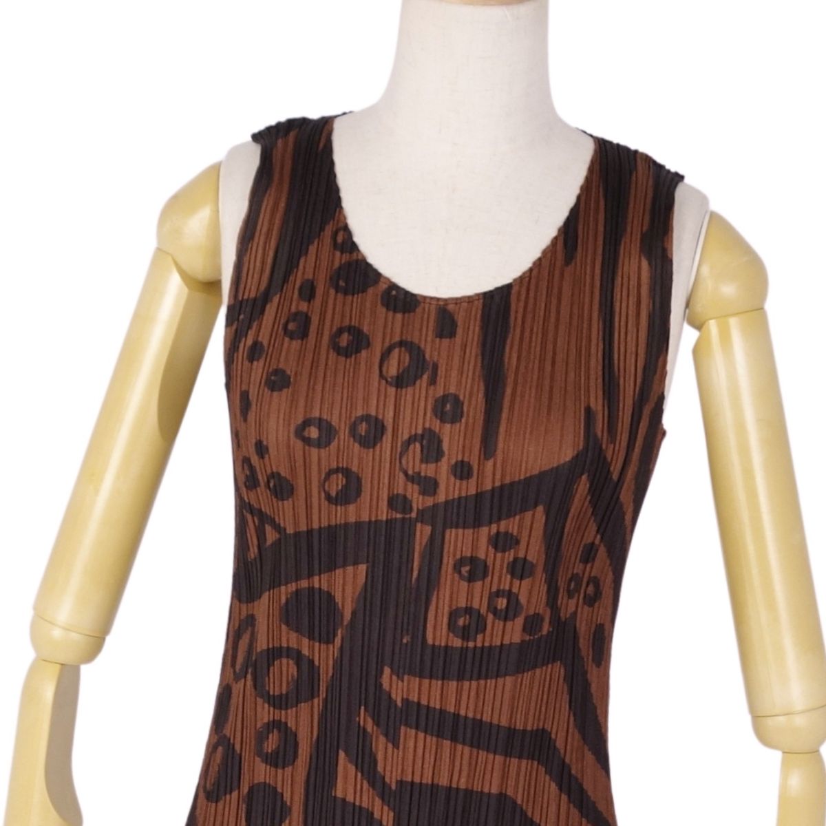 プリーツプリーズ イッセイミヤケ PLEATS PLEASE ワンピース ノースリーブ 総柄 トップス レディース ブラウン サイズ3(L相当)