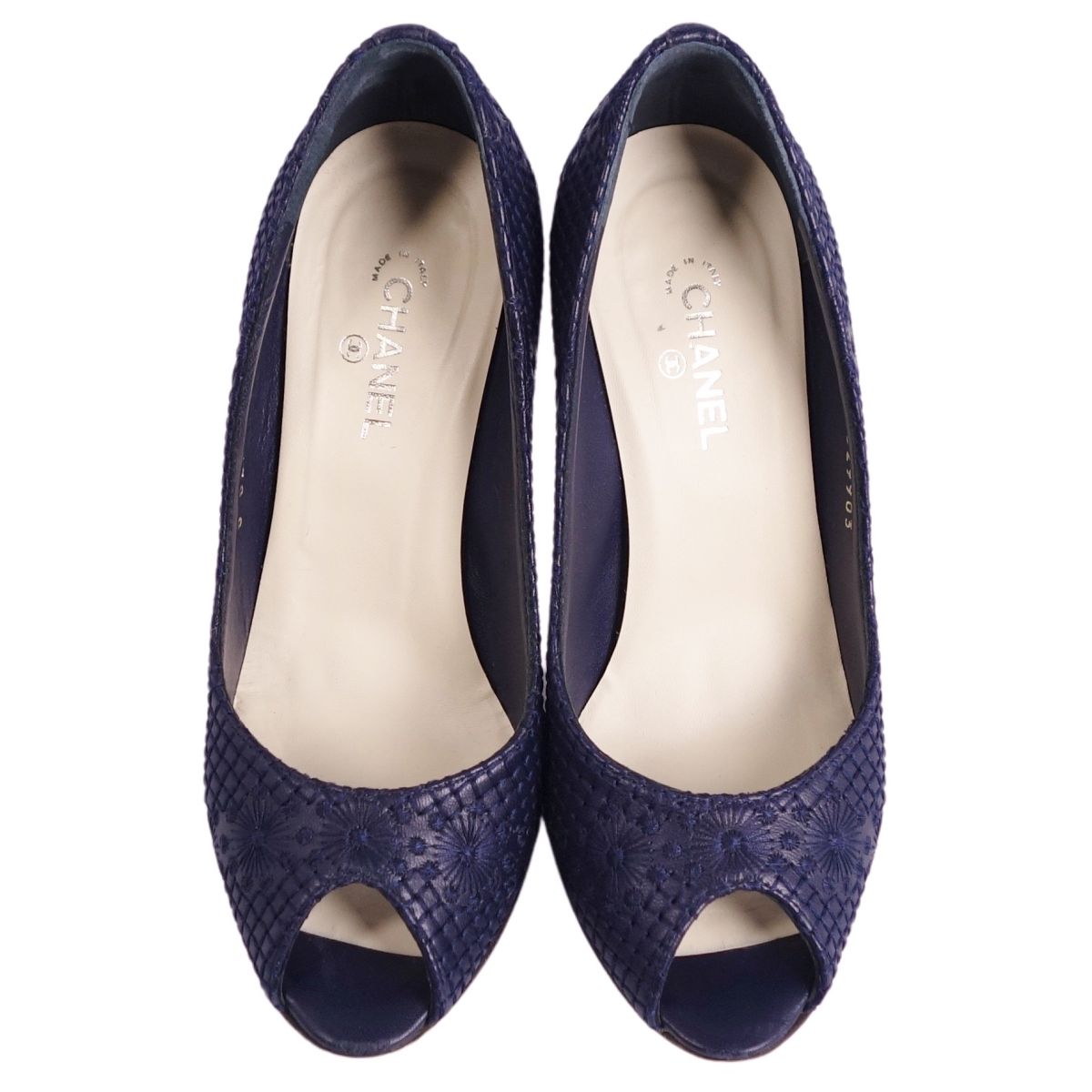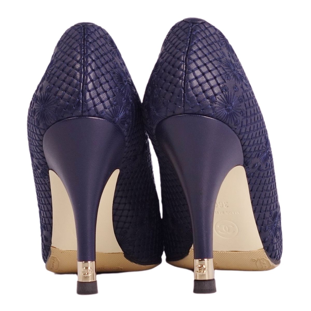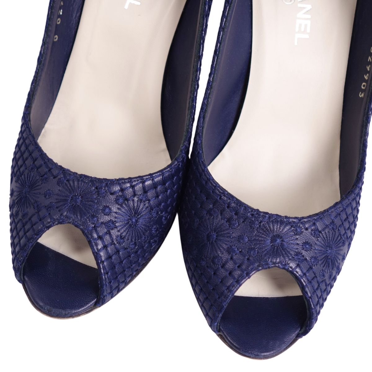 シャネル CHANEL パンプス オープントゥ 総柄 刺繍 レザー ココマーク シューズ レディース ネイビー サイズ36C