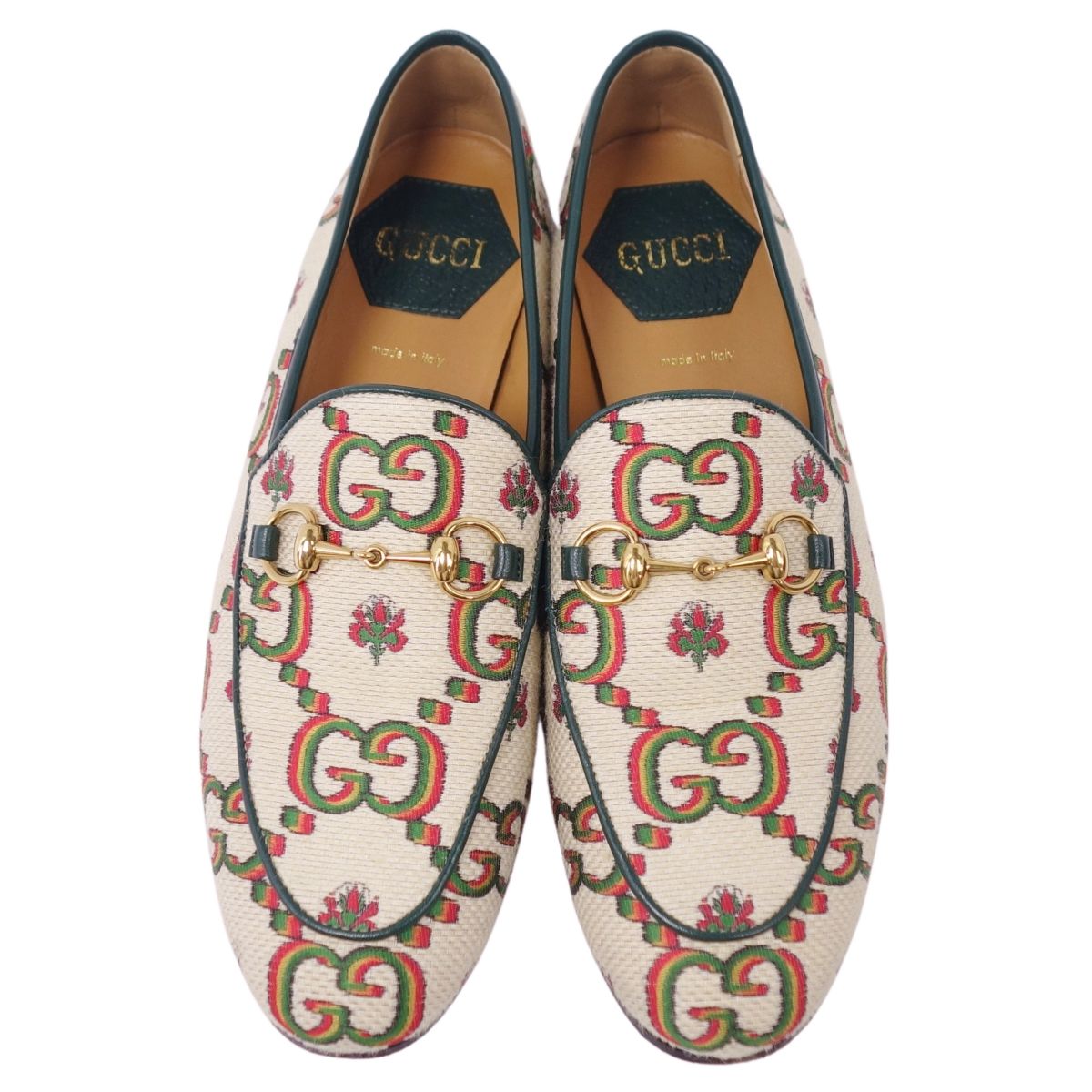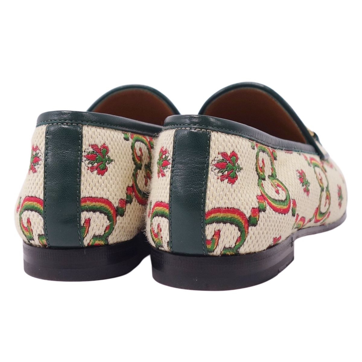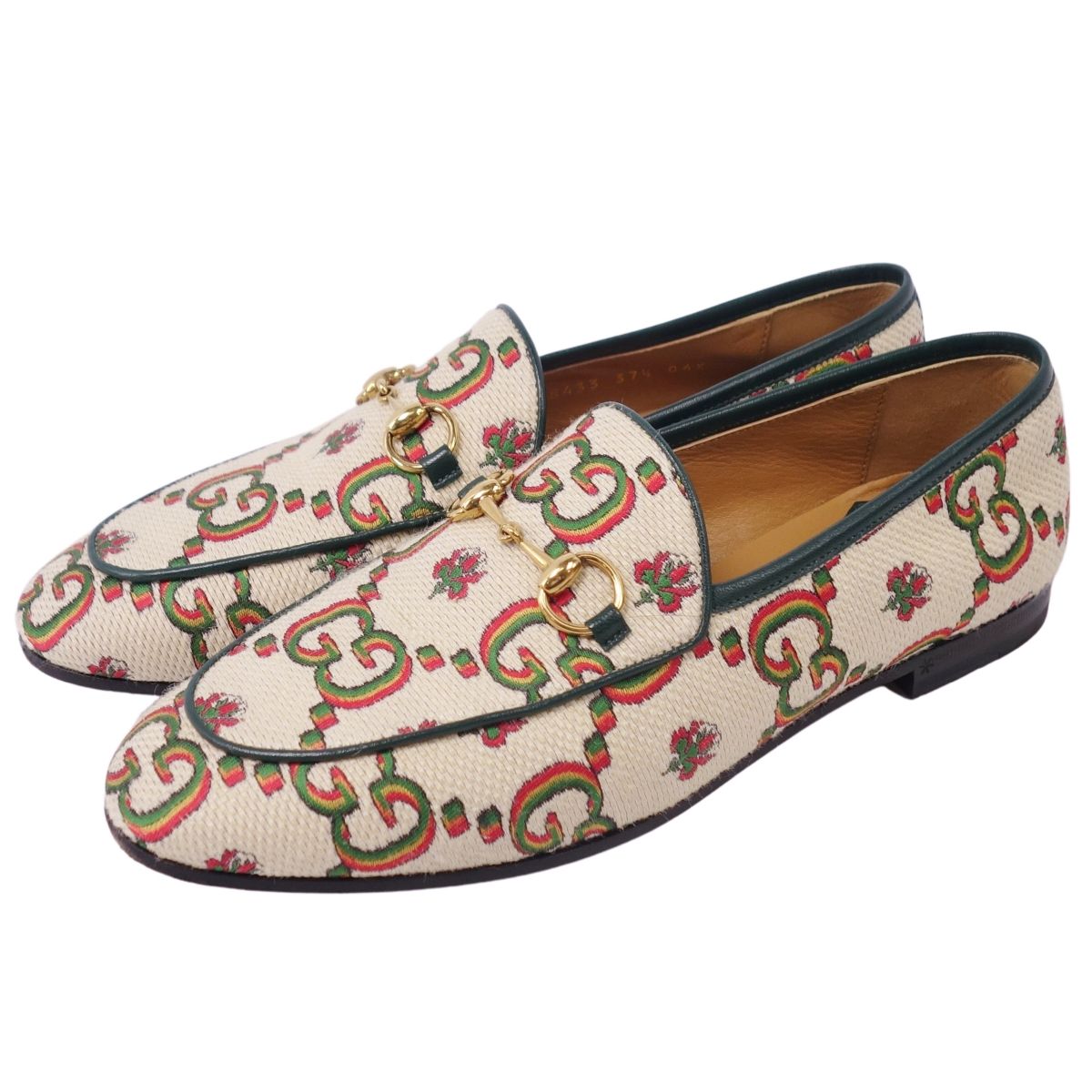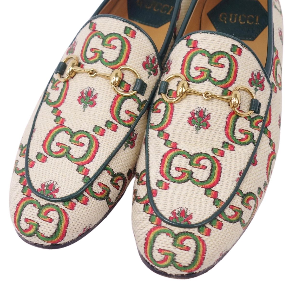 グッチ GUCCI ローファー モカシン 100周年 GG柄 ホースビット キャンバス シューズ 靴 レディース イタリア製 ベージュ/グリーン サイズ37.5(24.5cm相当)