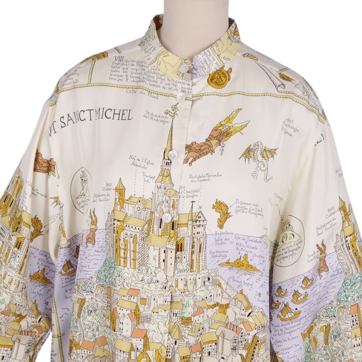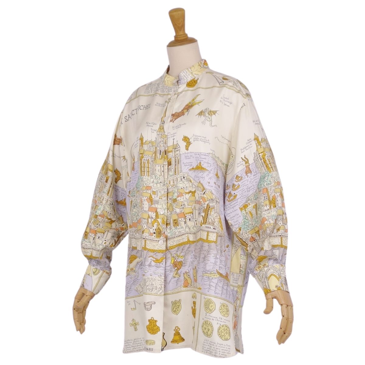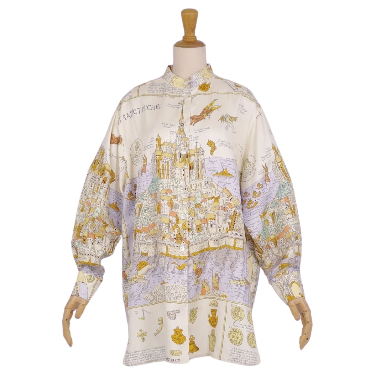 商品名 Vintage エルメス HERMES シャツ ブラウス Mont Sainct Michel モンサンミッシェル スタンドカラー ロングスリーブ 長袖 総柄 シルク トップス レディース フランス製 40(M相当) マルチカラー【中古】