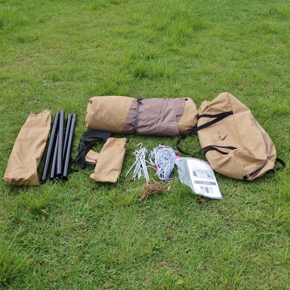 【付属品:本体、メインポール×1、ペグ16本、張り綱、設営用ガイドセット、説明書、収納袋】