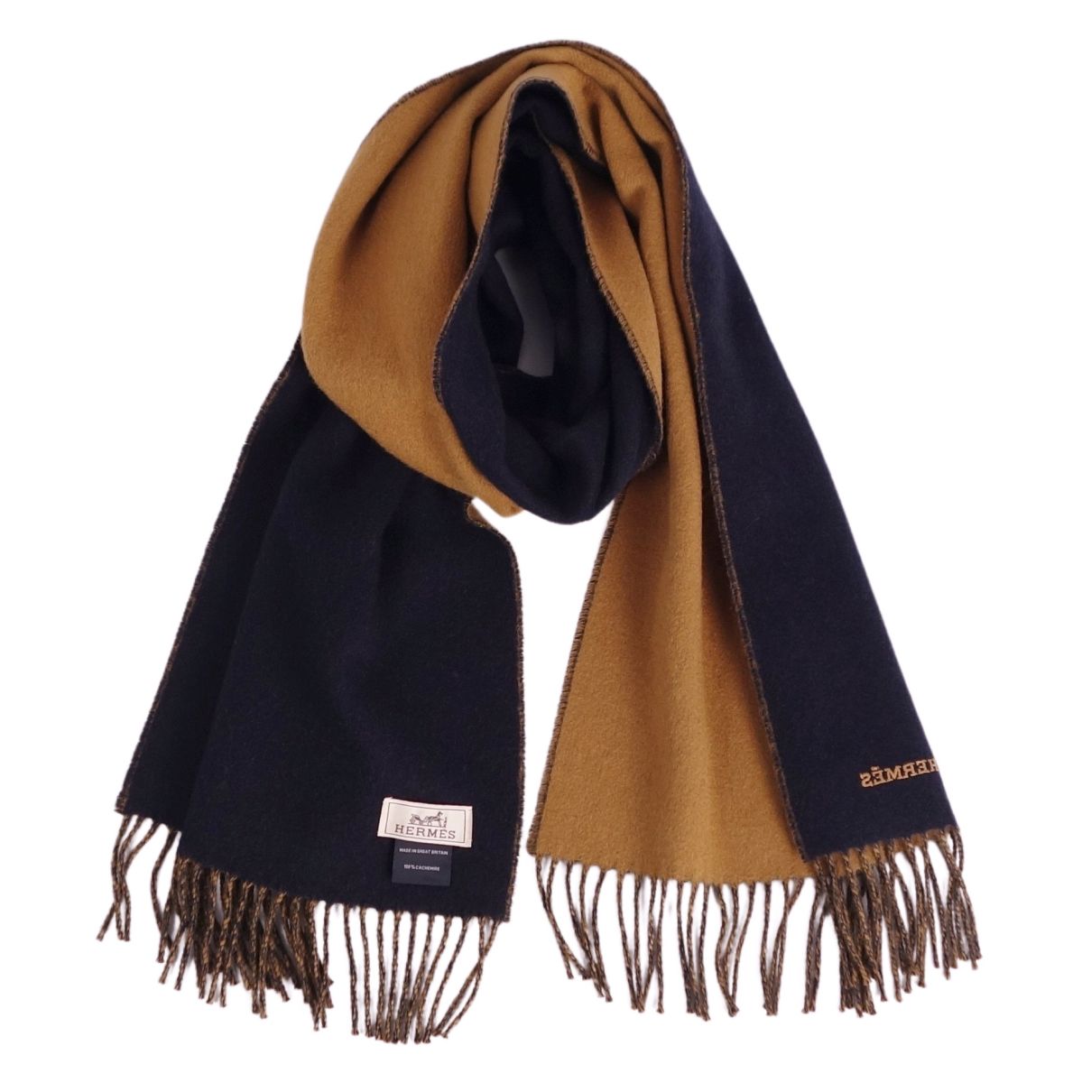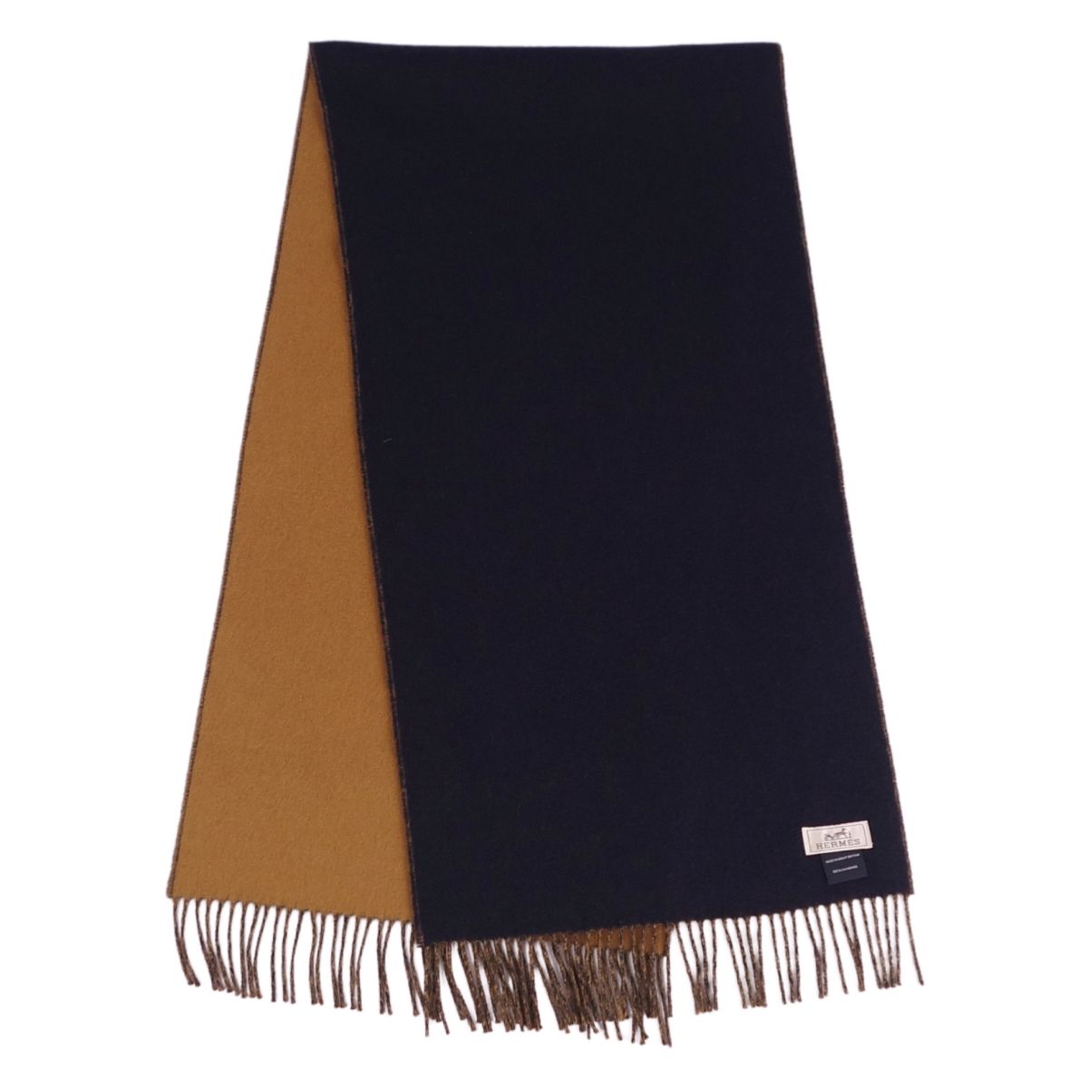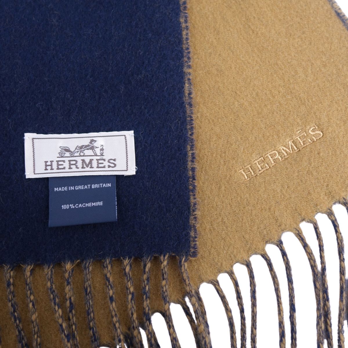 エルメス HERMES マフラー ストール レクトヴェルソ ダブルフェイス カシミヤ100% リバーシブル フリンジ ロゴ刺繍 イギリス製 メンズ ベージュ/ネイビー サイズ-