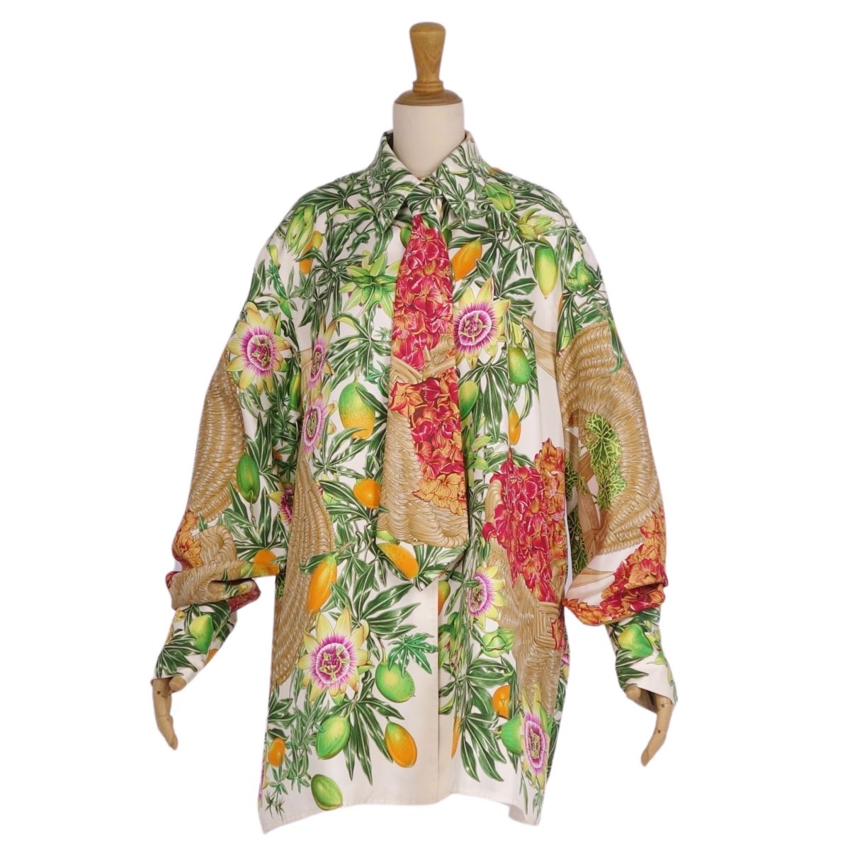 Vintage エルメス HERMES シャツ ブラウス タイ付き ロングスリーブ 長袖 総柄 シルク トップス レディース フランス製 マルチカラー サイズ44(XL相当)