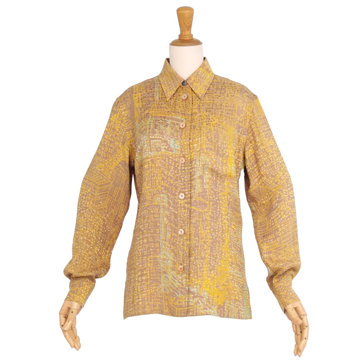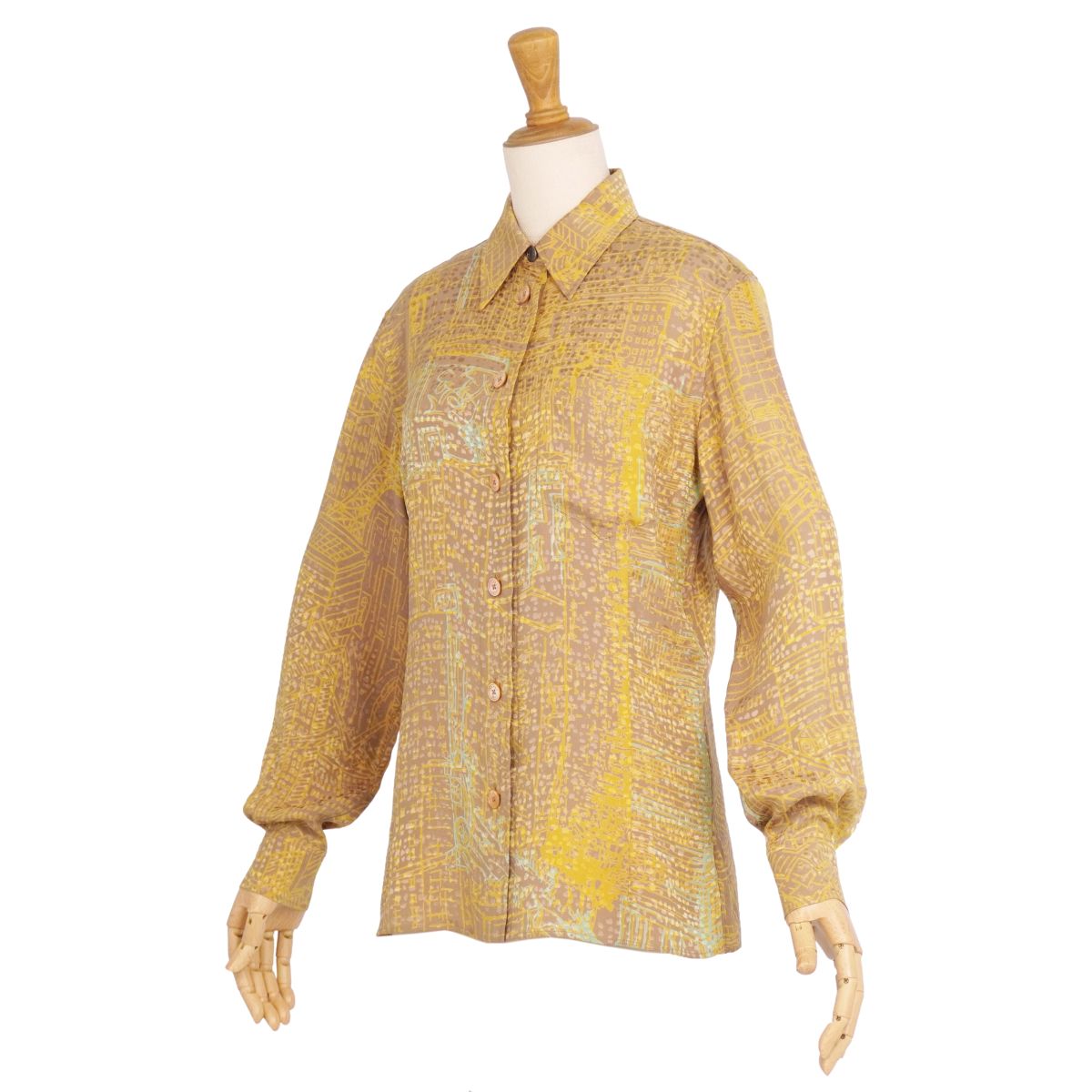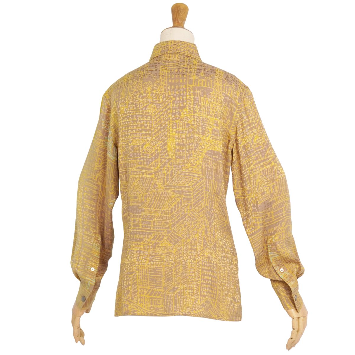 【美品】エルメス HERMES シャツ ゴルチエ期 ブラウス ロングスリーブ 長袖 総柄 シルク トップス レディース フランス製 36(S相当) イエロー【中古】