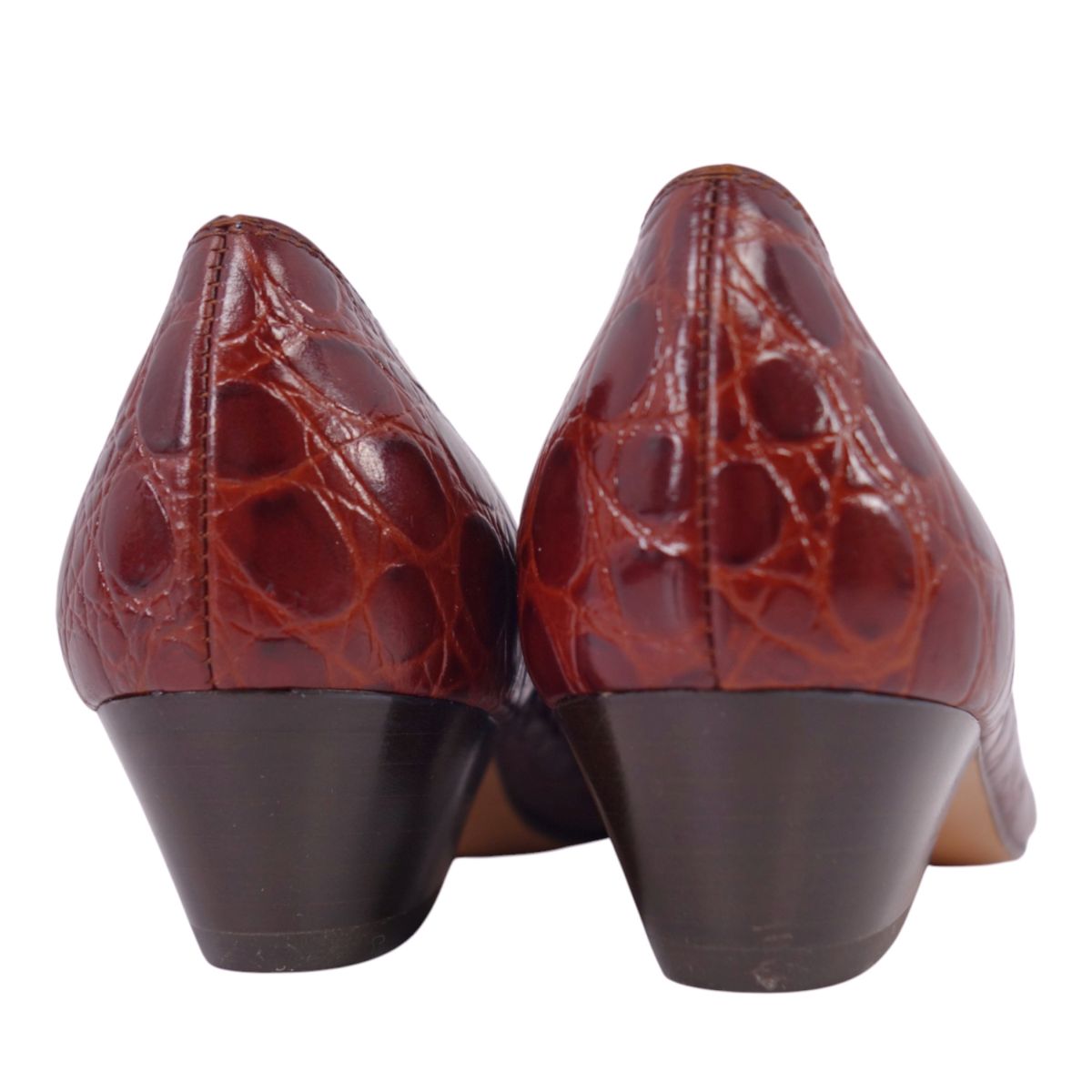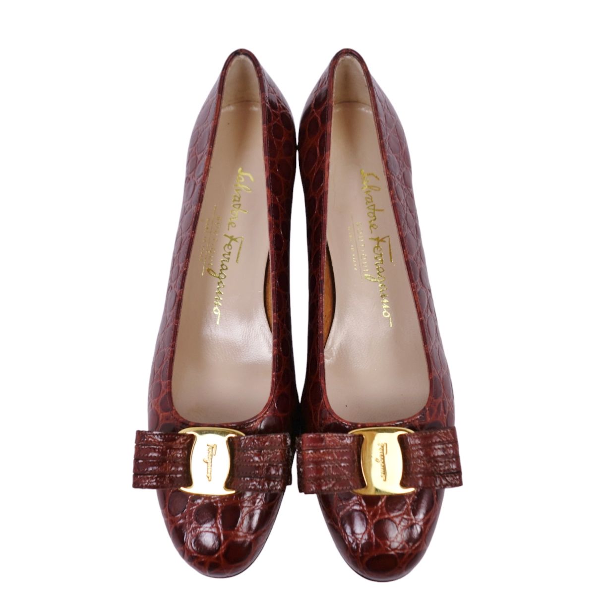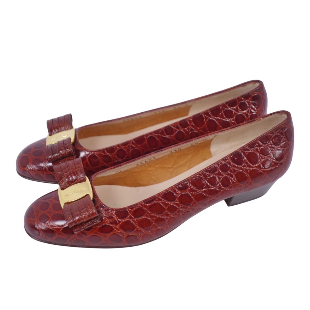 サルヴァトーレ フェラガモ Salvatore Ferragamo パンプス ヴァラ リボン ラウンドトゥ クロコ型押し ヒール レザー イタリア製 シューズ 靴 レディース ブラウンレッド サイズ5.5C(23cm相当)