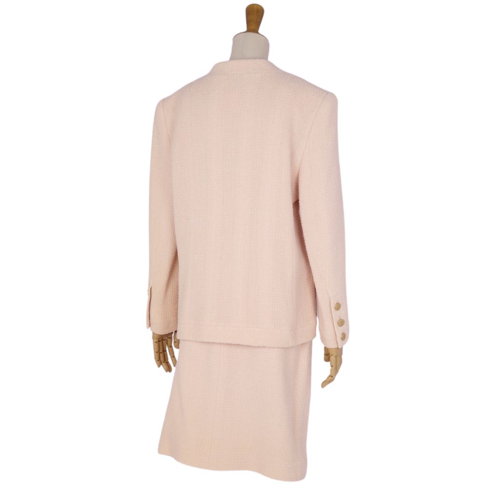 ・鮮やかなベージュのツイードを使用したフェミニンなデザイン。ジャケットにはココマークボタンを使用したアイコニックな一着です◎