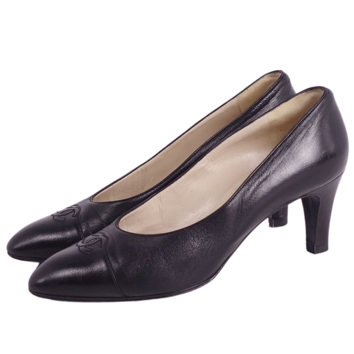 【美品】Vintage シャネル CHANEL パンプス ヒール キャップトゥ ココマーク ステッチ レザー シューズ レディース 36 ブラック【中古】