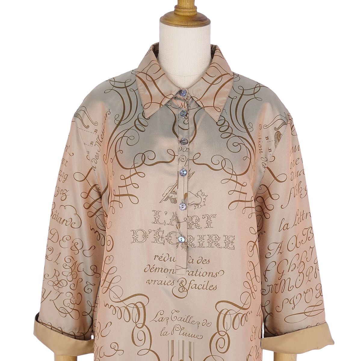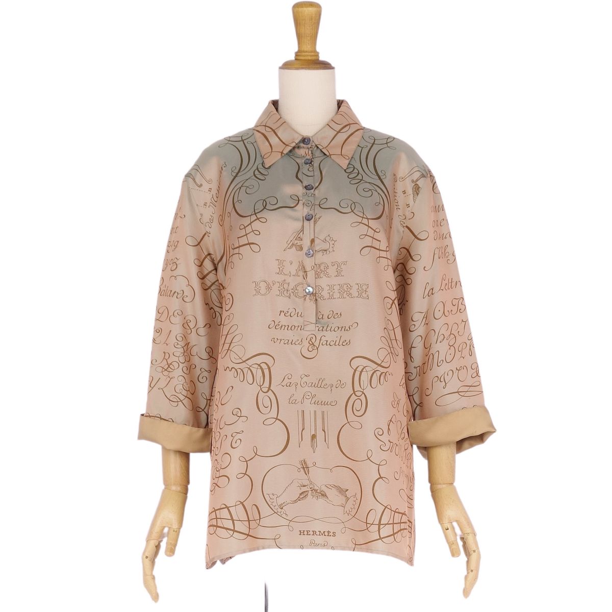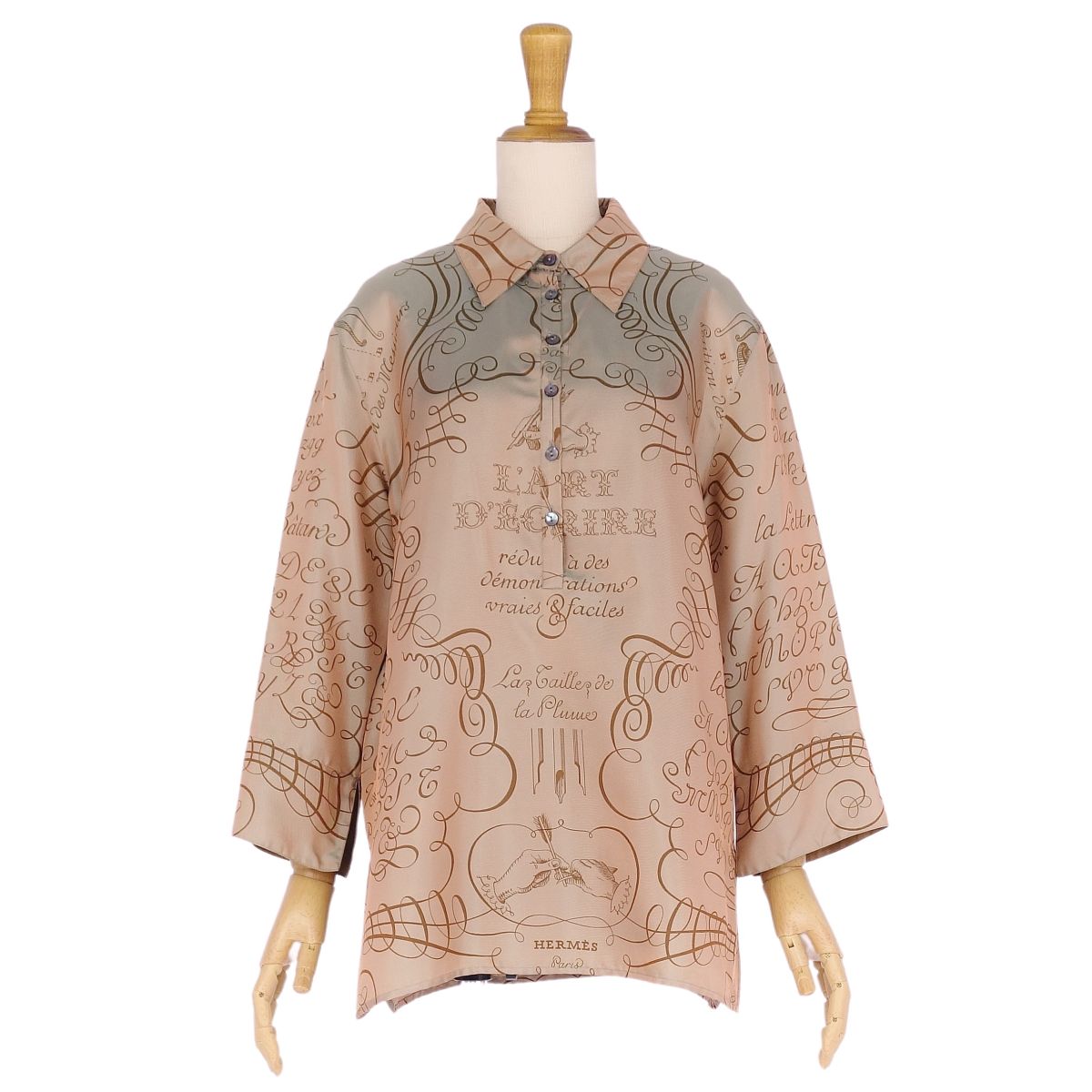 エルメス HERMES シャツ ブラウス マルジェラ期 ロングスリーブ LART DECRIRE 書の芸術 シルク100% トップス レディース ブラウン サイズ38(M相当)