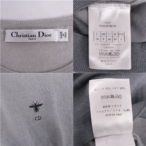 商品名 【美品】クリスチャンディオール Christian Dior ニット セーター ロングスリーブ 長袖 Bee刺繍 カシミヤ シルク トップス レディース F36 USA4 I40(S相当) グレー【中古】