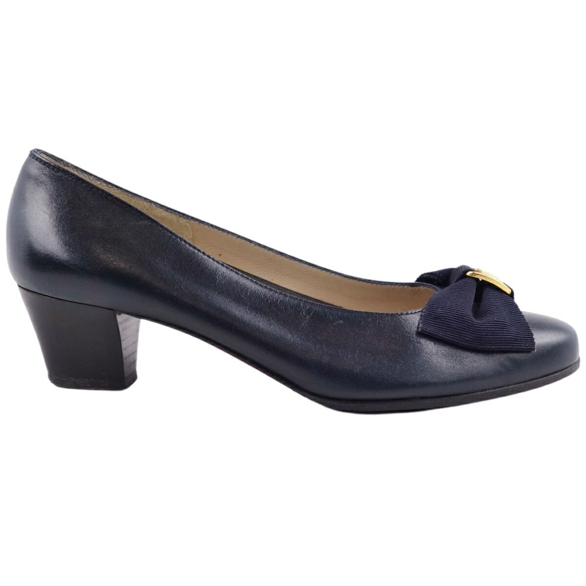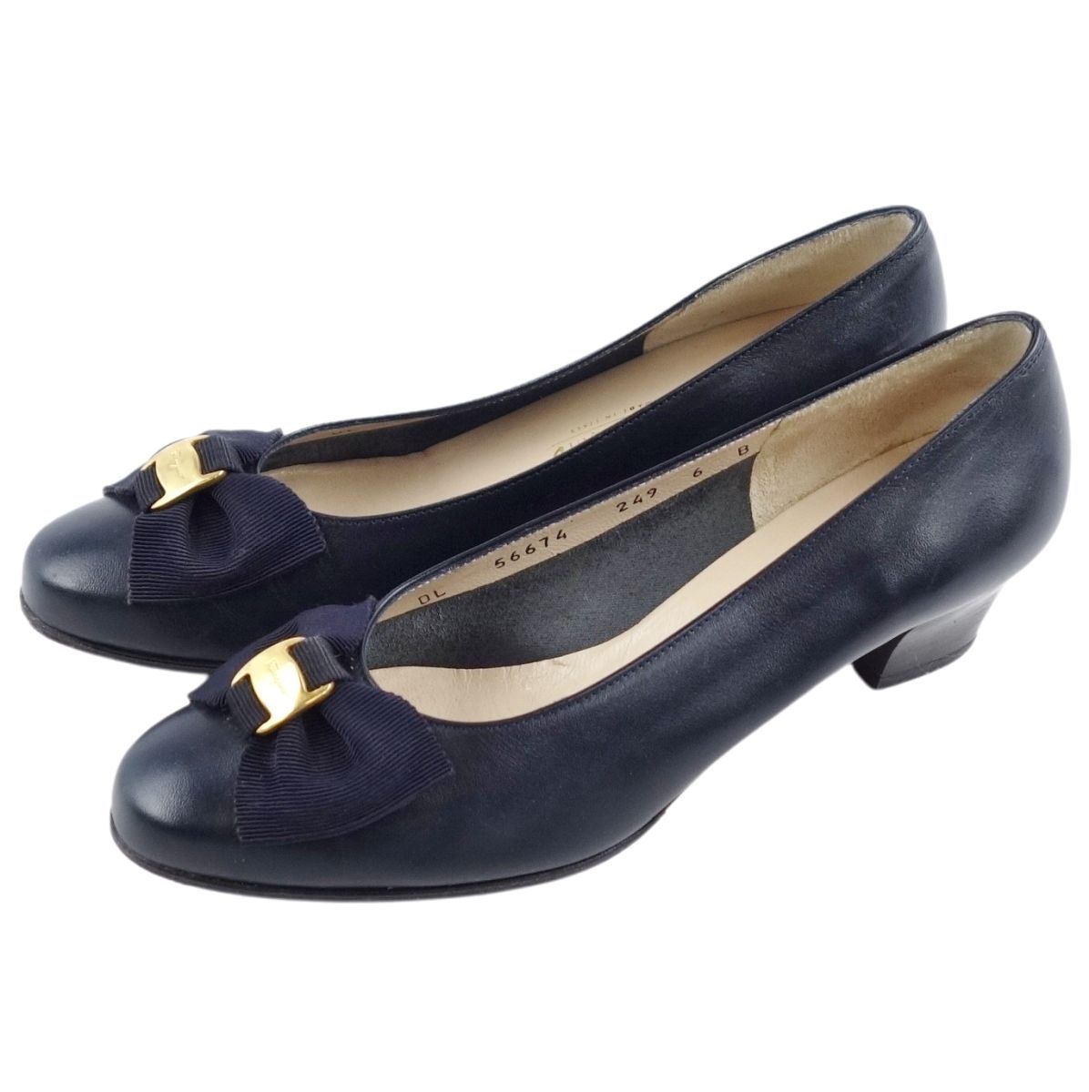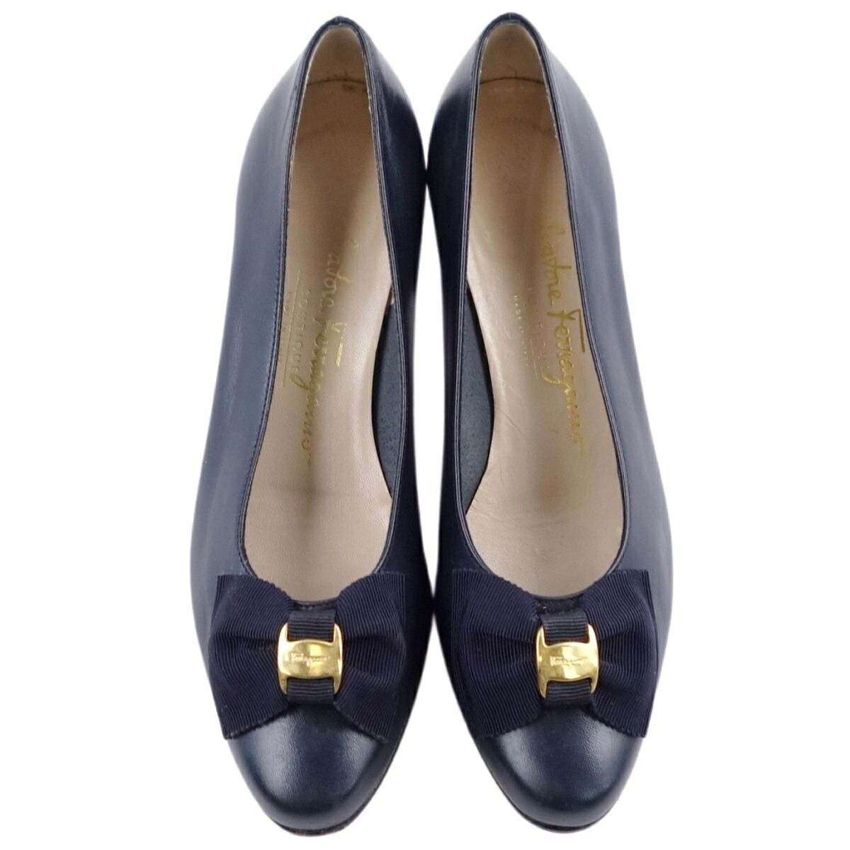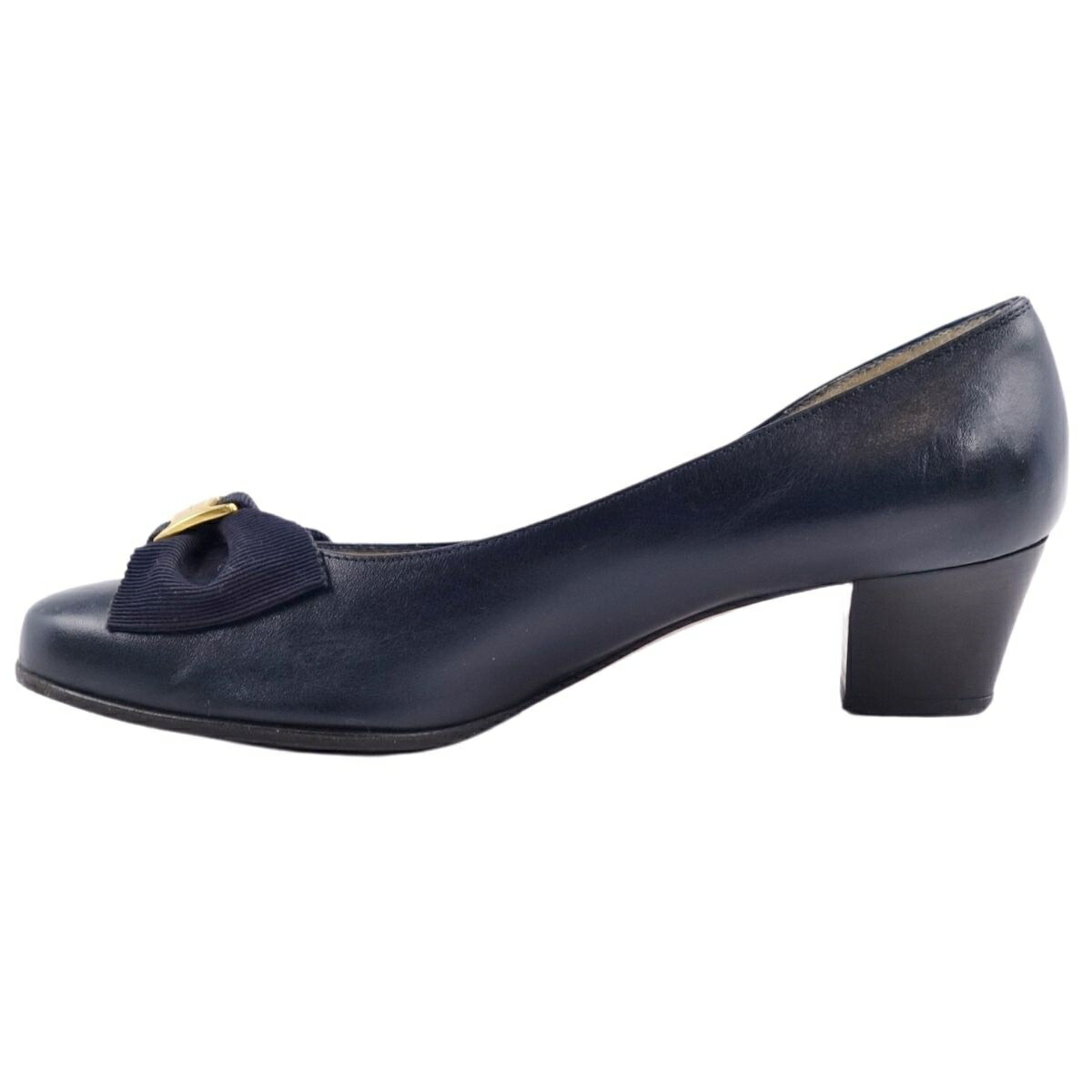 【美品】サルヴァトーレ フェラガモ Salvatore Ferragamo シューズ パンプス ヴァラ レザー 本革 リボン レディース 靴 イタリア製 6B(23.5cm相当) ネイビー【中古】