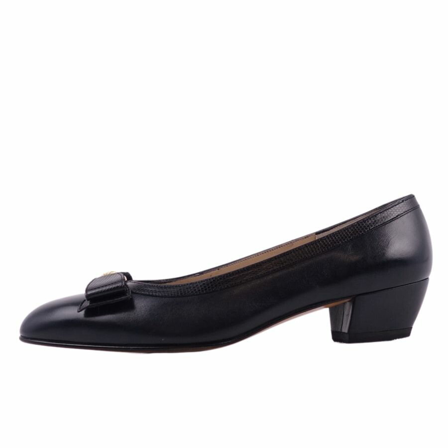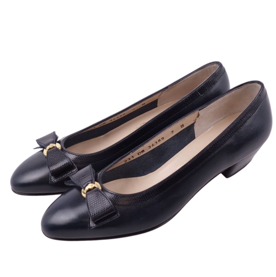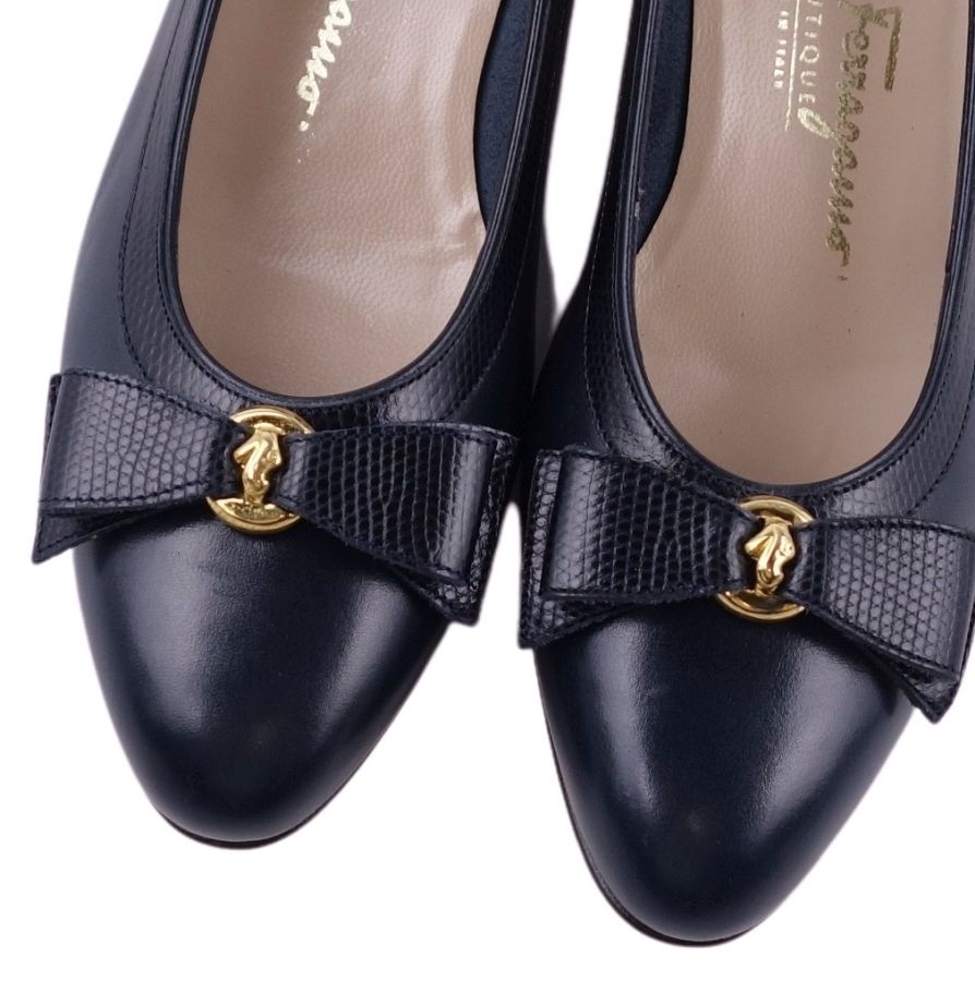 商品名 【新品同様】サルヴァトーレ フェラガモ Salvatore Ferragamo パンプス リボン リザード型押し ヒール シューズ 靴 シューズ 靴 レディース 7B(24.5cm相当) ネイビー レディースシューズ【中古】