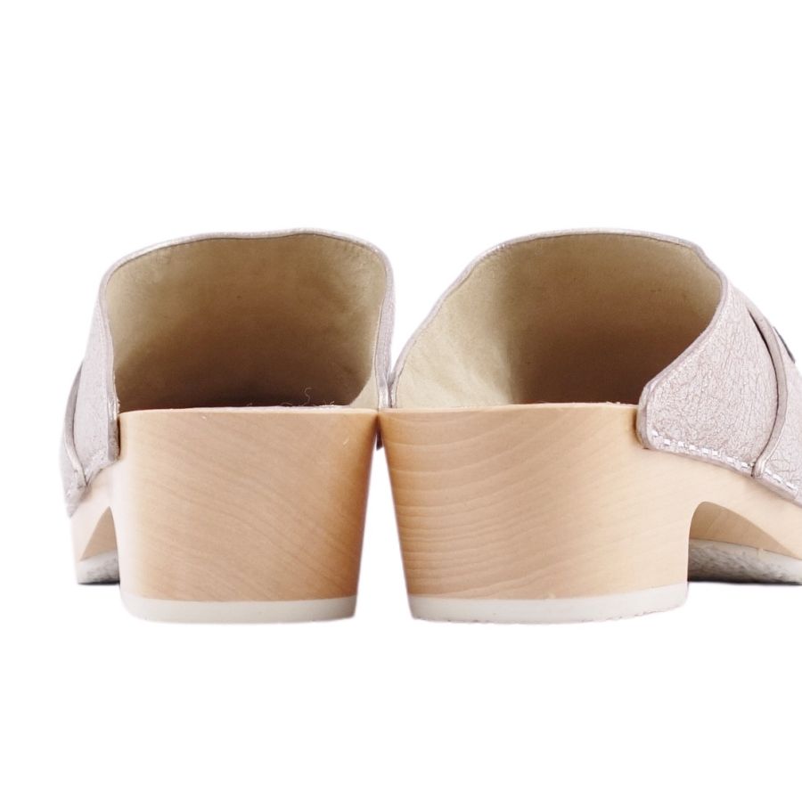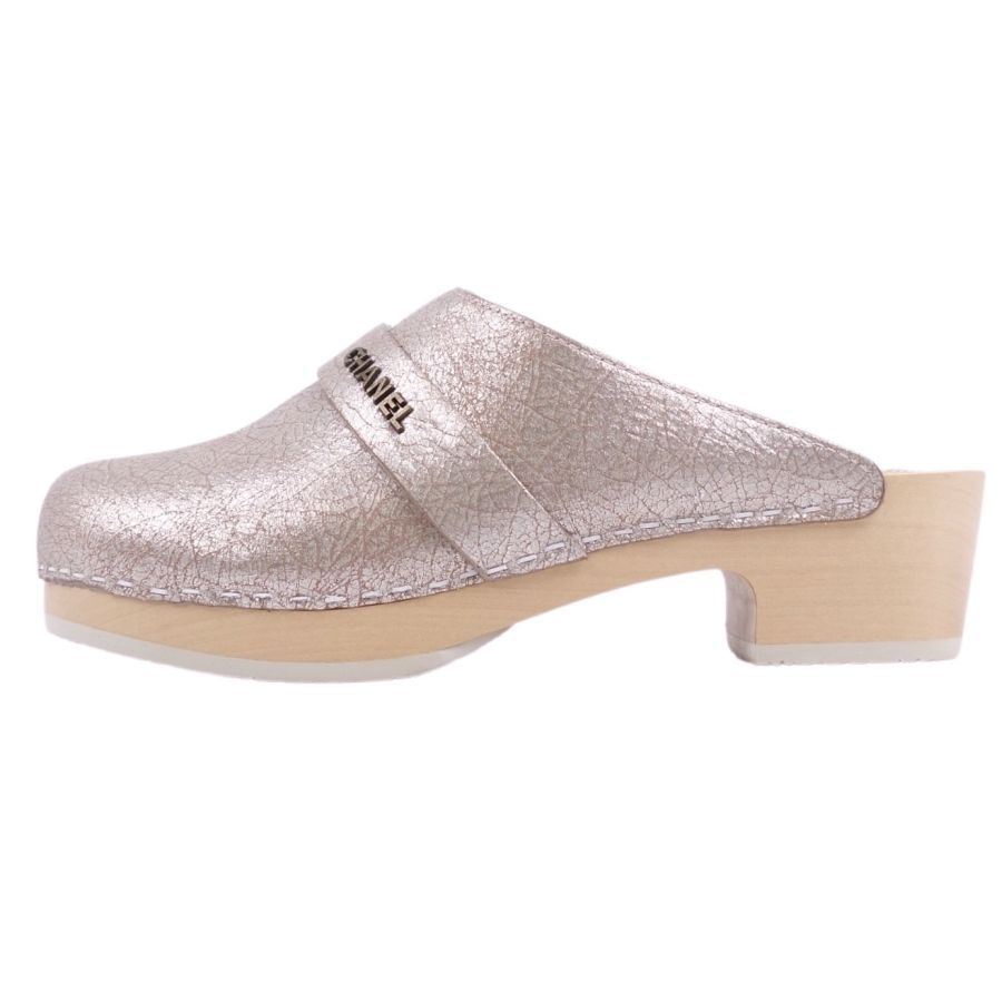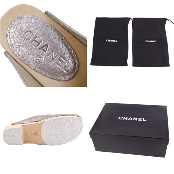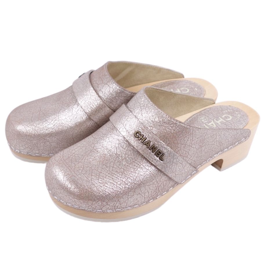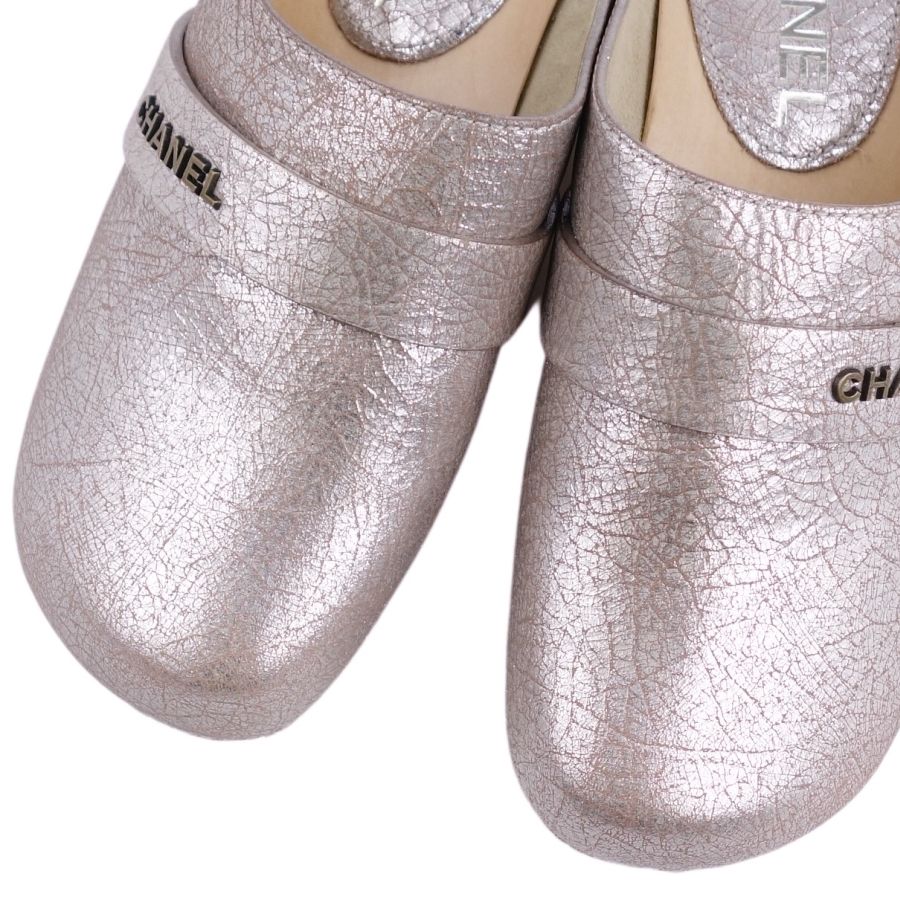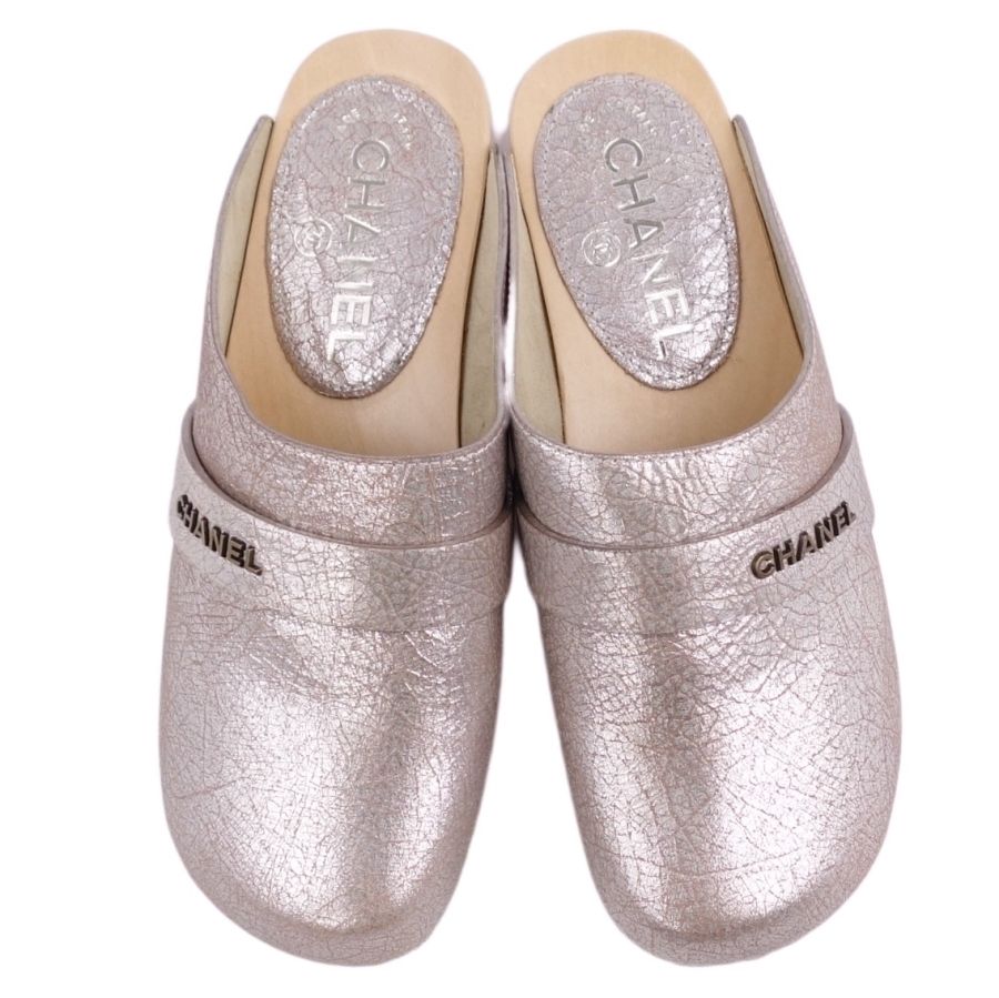 シャネル CHANEL サンダル サボサンダル ロゴ レザー ウッドソール シューズ 靴 レディース イタリア製 シルバー サイズ35.5