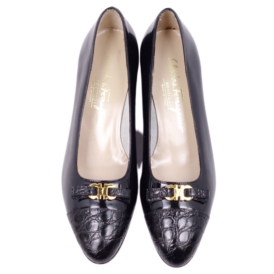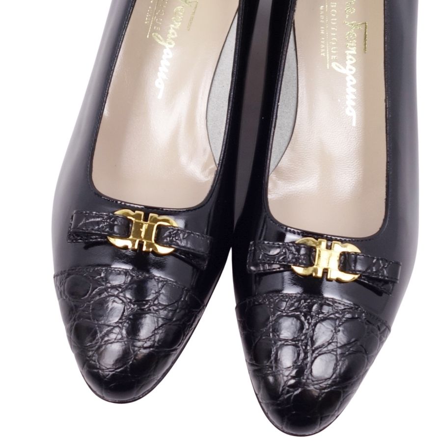 サルヴァトーレ フェラガモ Salvatore Ferragamo パンプス クロコ型押し ガンチーニ エナメル ヒール シューズ 靴 レディース ブラック サイズ7 1/2B(25cm相当)