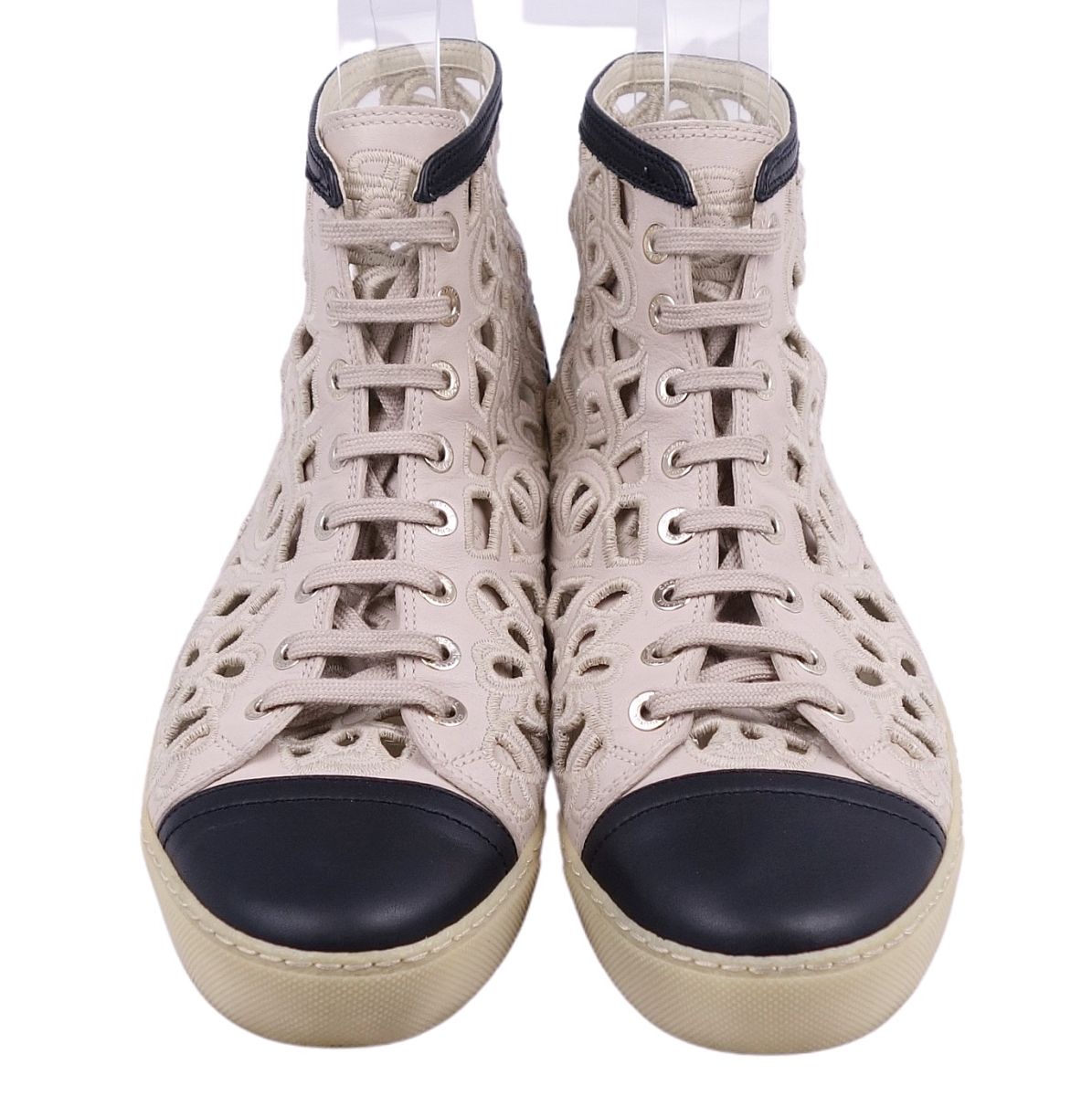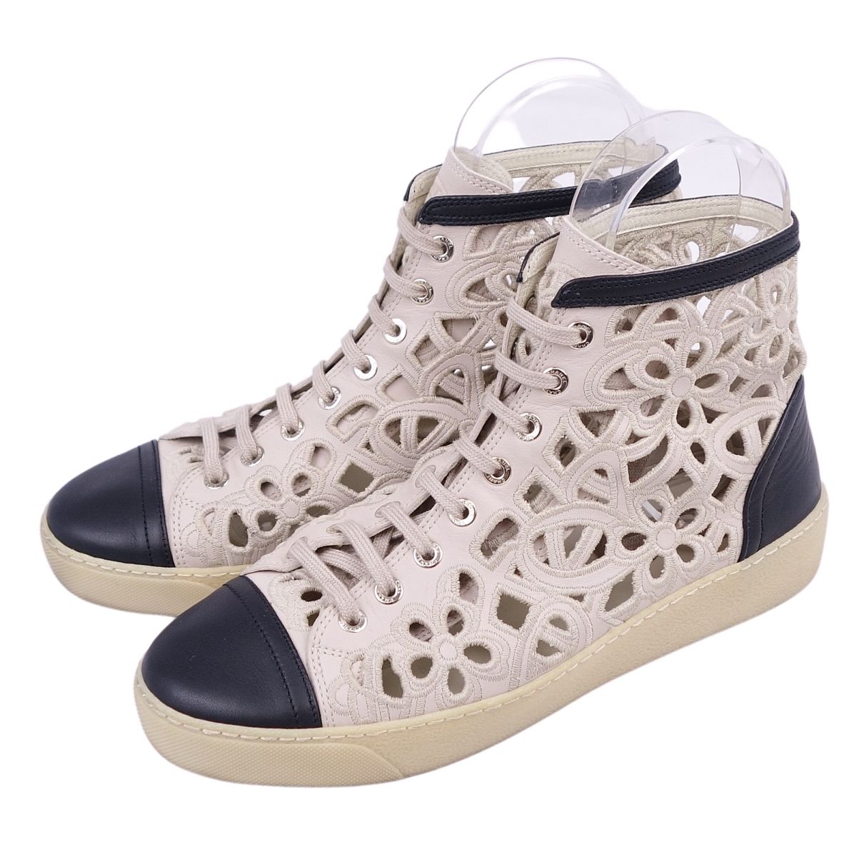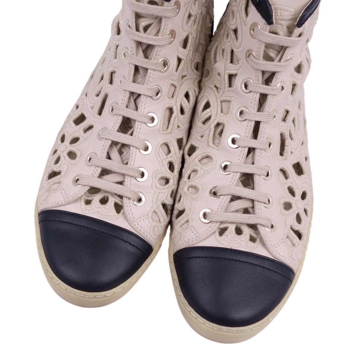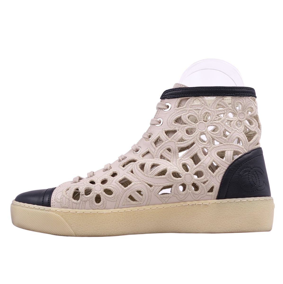 シャネル CHANEL スニーカー ココマーク バイカラー フラワー 花柄 カーフレザー レースアップ レディース シューズ 靴 ブラック/グレージュ サイズ39