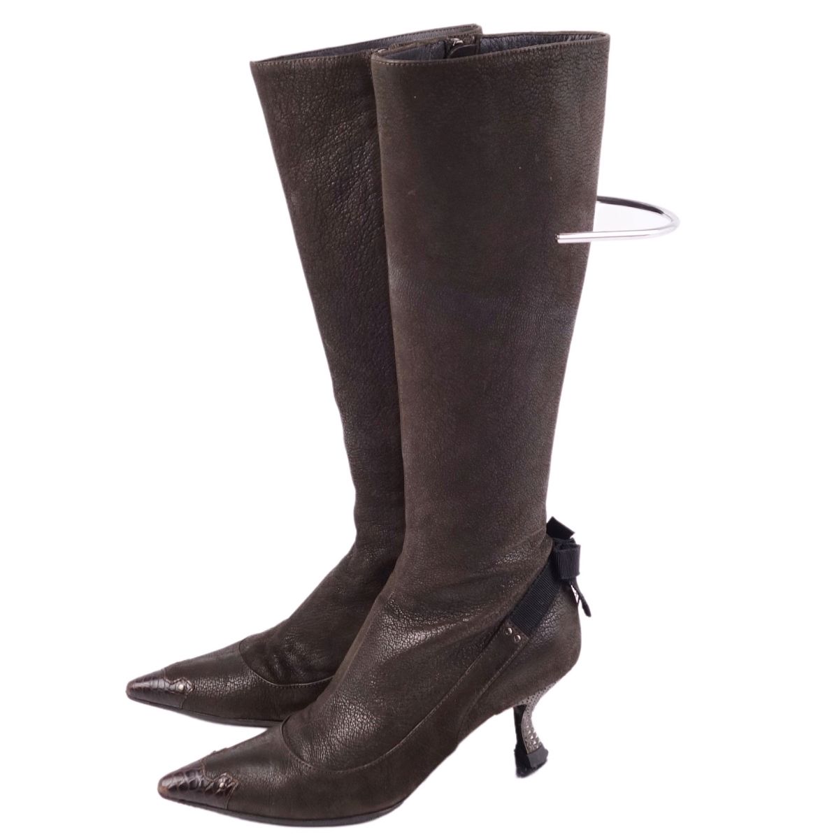 プラダ PRADA ブーツ ロングブーツ ヒール ラムレザー クロコ型押し シューズ レディース ダークブラウン サイズ34(21cm相当)