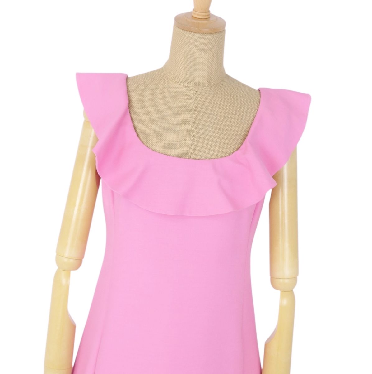 ・鮮やかなピンクが目を引く一着。襟にあしらわれたフリルや美しく広がるフレアシルエットがフェミニンなスタイリングを演出します◎