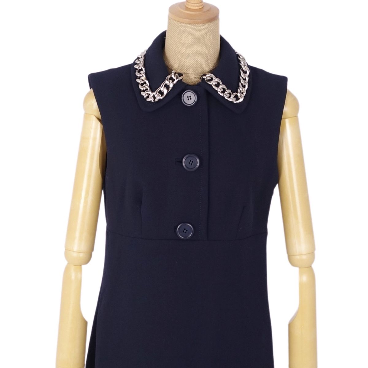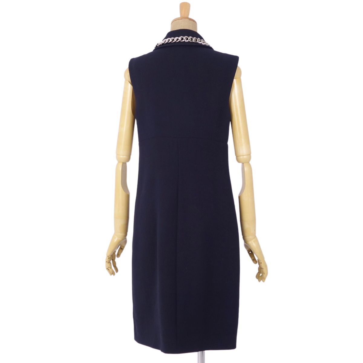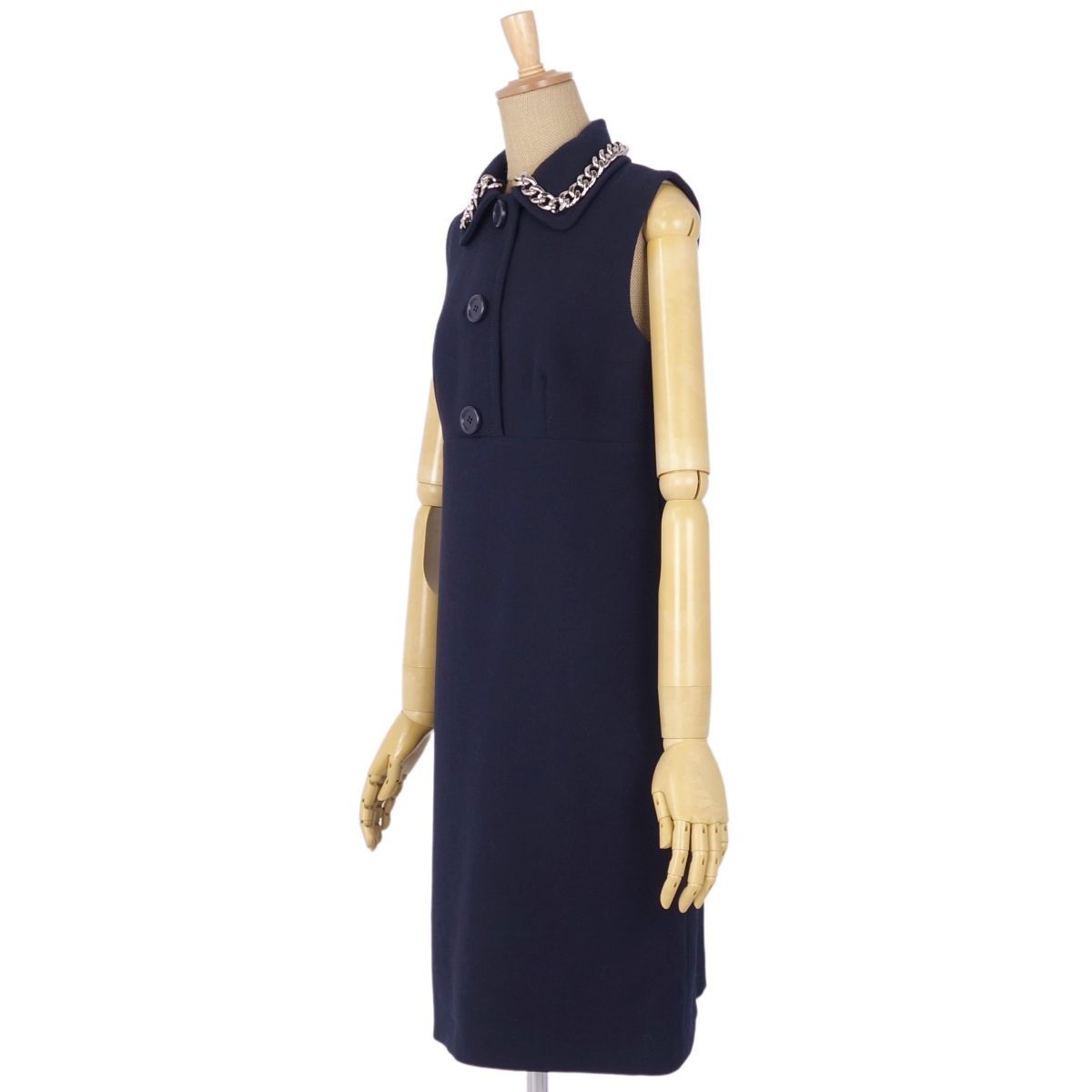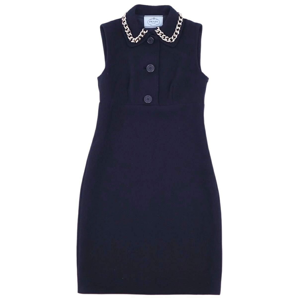 プラダ PRADA ウール ノースリーブ ワンピース チェーン カラー トップス レディース イタリア製 ネイビー 紺 サイズ38(S相当)