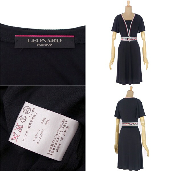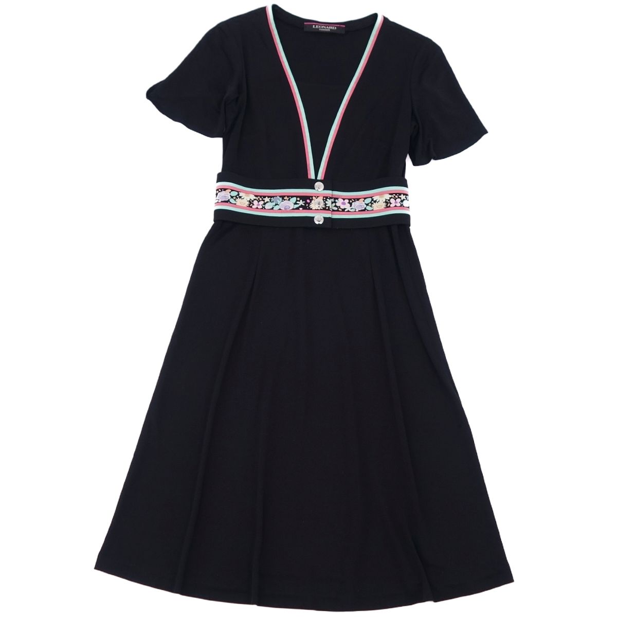 レオナール LEONARD FASHION ベルト付き 花柄 半袖 ワンピース 1 ジャージー トップス レディース ブラック サイズ1(S相当)